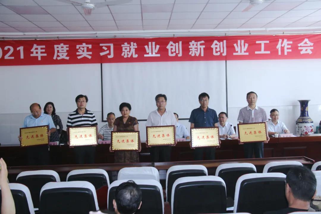 会上,与会领导给就业创业先进集体颁发奖牌。先进集体代表建筑工程学院、食品学院分别发言。