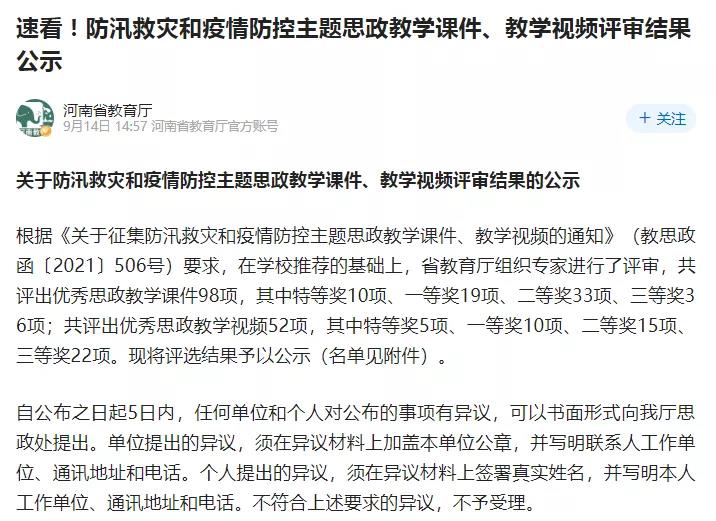 近日,中共河南省委高校工委河南省教育厅发布《关于防汛救灾和疫情防控主题思政教学课件、教学视频评审结果的公示》,太阳成tyc7111cc思政部姬姝琦老师作品《风雨中铸就中国精神征程中点亮青春之光》荣获防汛救灾和疫情防控主题思政教学视频二等奖,黄莹莹老师作品《把灾难当教材与青年共成长》荣获防汛救灾和疫情防控主题思政教学课件三等奖。