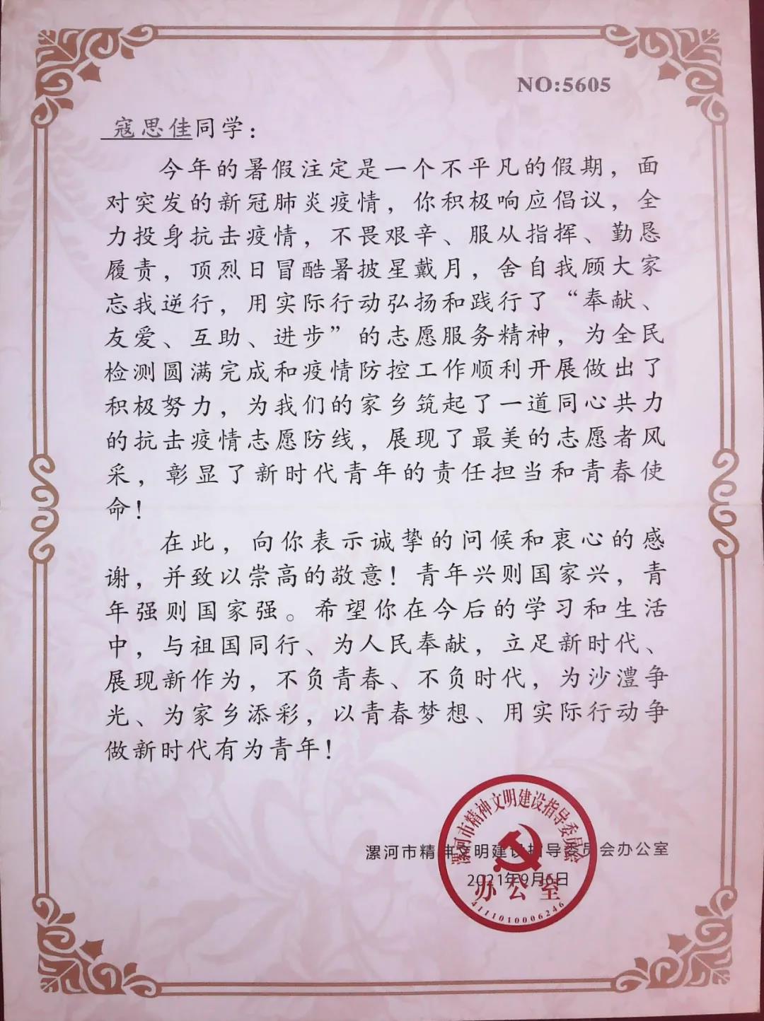 日前,漯河职院收到漯河市精神文明建设指导委员会办公室寄来的感谢信。信中对我校寇思佳同学在2021年疫情防控期间的优秀表现进行了表扬,同时对我校表达了最真诚的感谢。