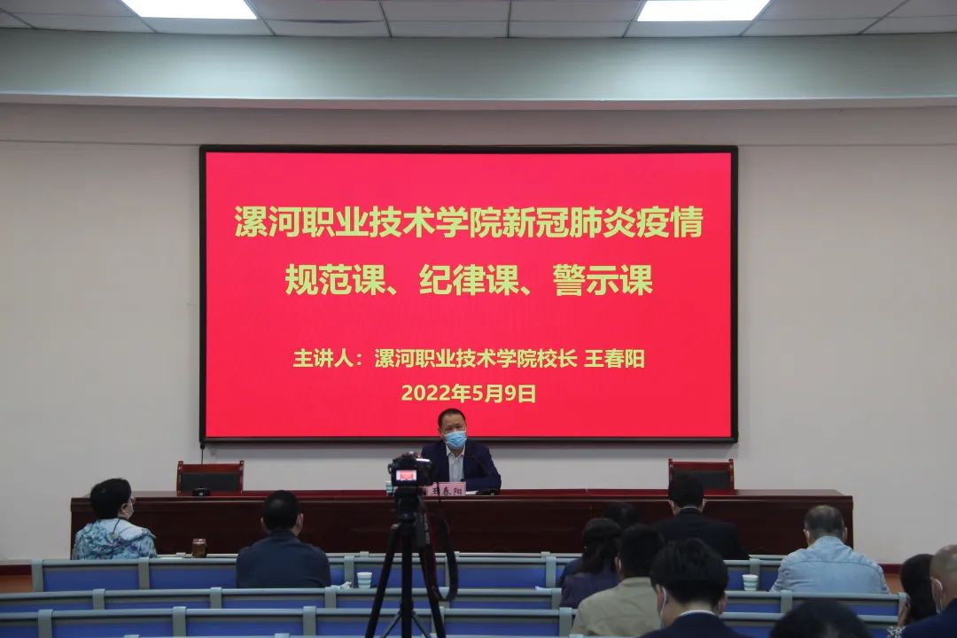 5月9日下午,太阳成tyc7111cc校长王春阳向全校教职员工、学生教授新冠肺炎疫情规范课、纪律课、警示课。