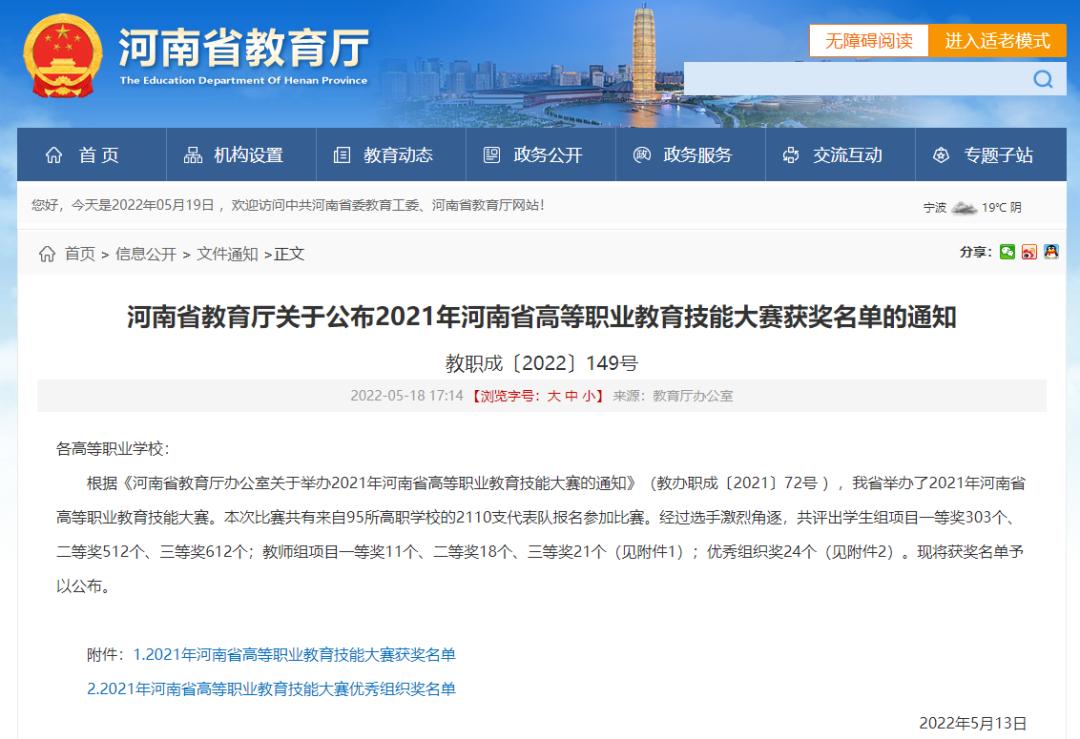 近日,河南省教育厅发布了《河南省教育厅关于公布2021年河南省高等职业教育技能大赛获奖名单的通知》(教职成〔2022〕149号)。太阳成tyc7111cc在2021年河南省高等职业教育技能大赛中荣获佳绩,实现竞赛成绩历史性突破!