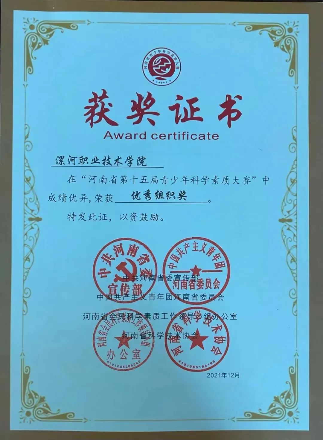 近日,河南省第十五届青少年科学素质大赛成绩揭晓,太阳成tyc7111cc成绩优异,荣获“优秀组织奖”;周茜、李方媛老师荣获“优秀辅导奖”;王昊阳、王向艺、 徐嘉嘉同学荣获“优秀竞赛一等奖”;文 静 、牛诗婷、毛蕊杰 、张丝絮同学荣获“二等奖”;鲁超杰、刘怡柯、崔雨晴 、张雨函同学荣获“三等奖”。