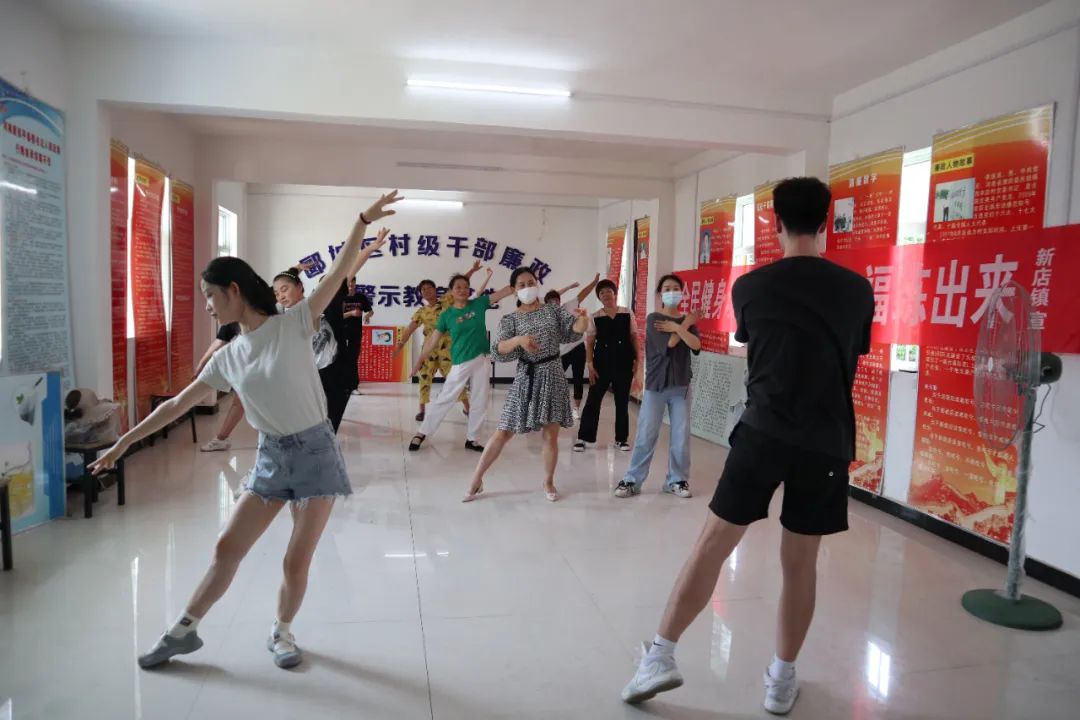 在二楼的教室里,镇上的舞蹈队员正跟着音乐舞蹈系的学生党员赵俊杰和墙格格刻苦地学习舞蹈《我和我的祖国》。在两位老师的指导下,大家很快就能跟着音乐“我和我的祖国,一刻也不能分割”的优美旋律翩翩起舞了。