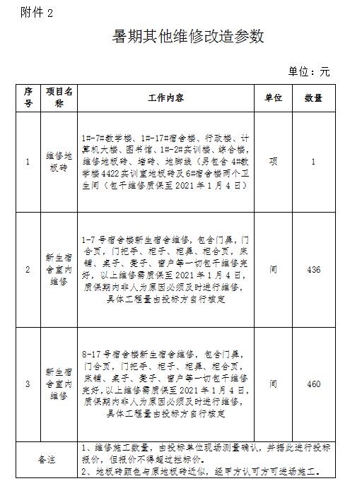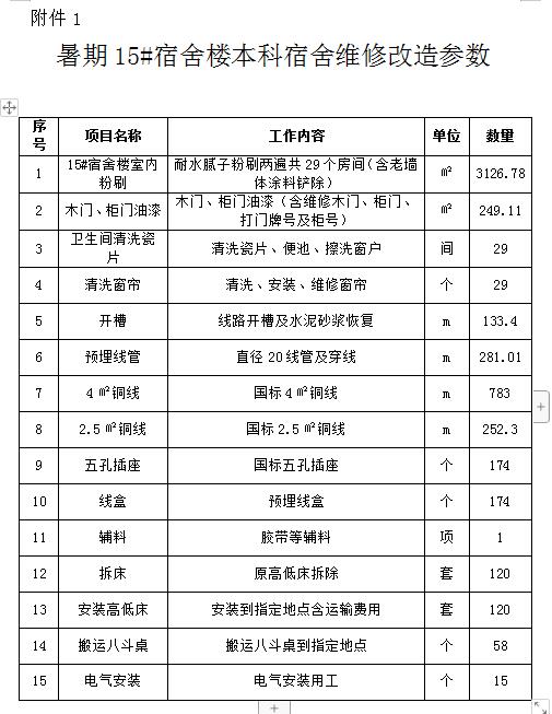 经学校批准,总务处暑期维修改造项目:A包15#宿舍楼维修改造;B包暑期其他维修改造,采用询价招标方式采购。