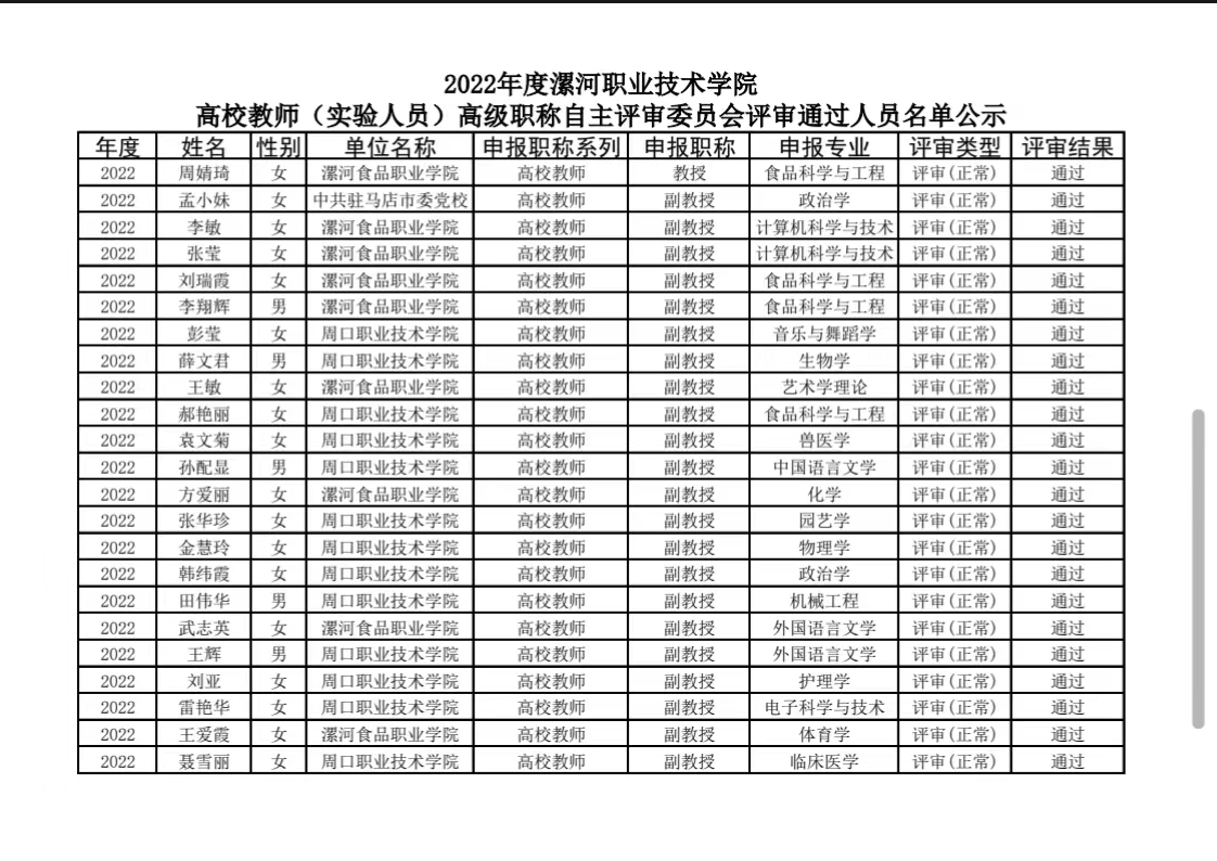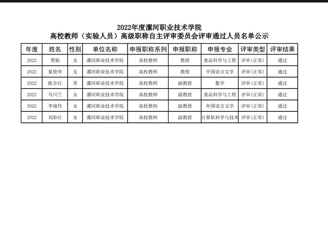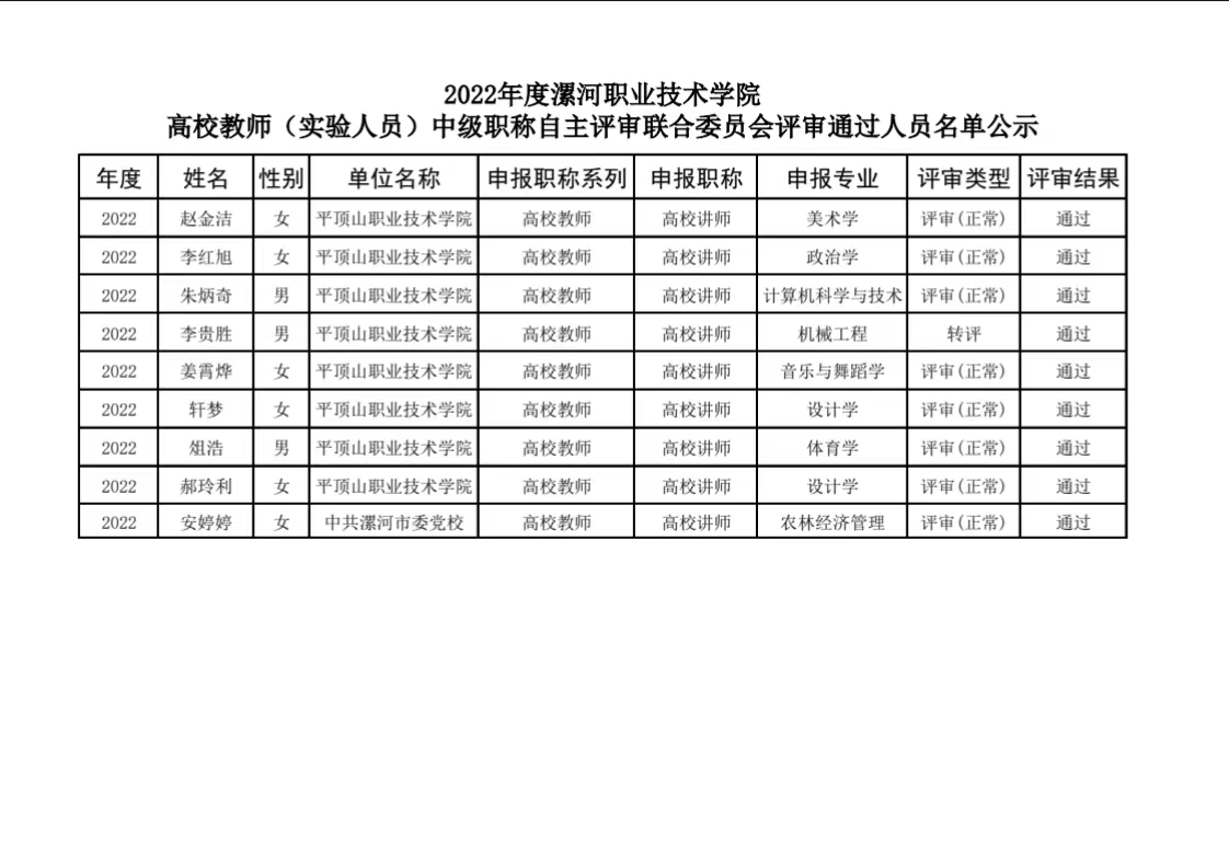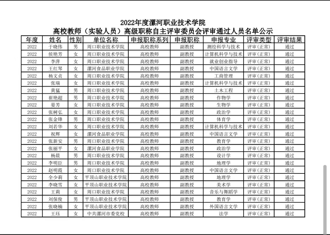 根据2022年省、市职称工作精神,2023年1月10日至11日召开了2022年度太阳成tyc7111cc高校教师(实验人员)高级职称自主评审委员会和太阳成tyc7111cc高校教师(实验人员)中级职称自主评审联合委员会,现将评审会承办单位参评人员及受理委托评审人员评审通过结果进行公示,欢迎广大教职工给予监督,如有异议,请向太阳成tyc7111cc职称评审改革领导小组办公室(下简称漯职院职改办)提出,漯职院职改办将集中复核。