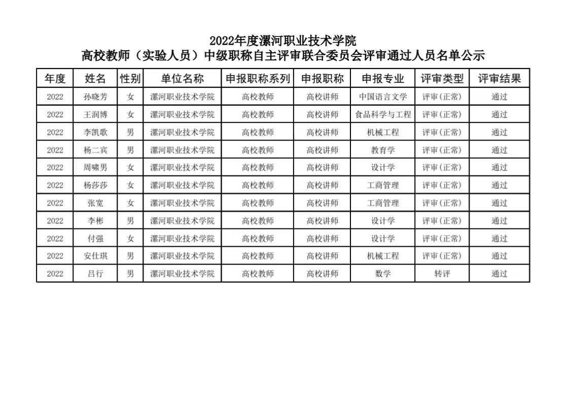 公示内容:2022年度太阳成tyc7111cc高校教师(实验人员)高级职称自主评审委员会和太阳成tyc7111cc高校教师(实验人员)中级职称自主评审联合委员会评审结果