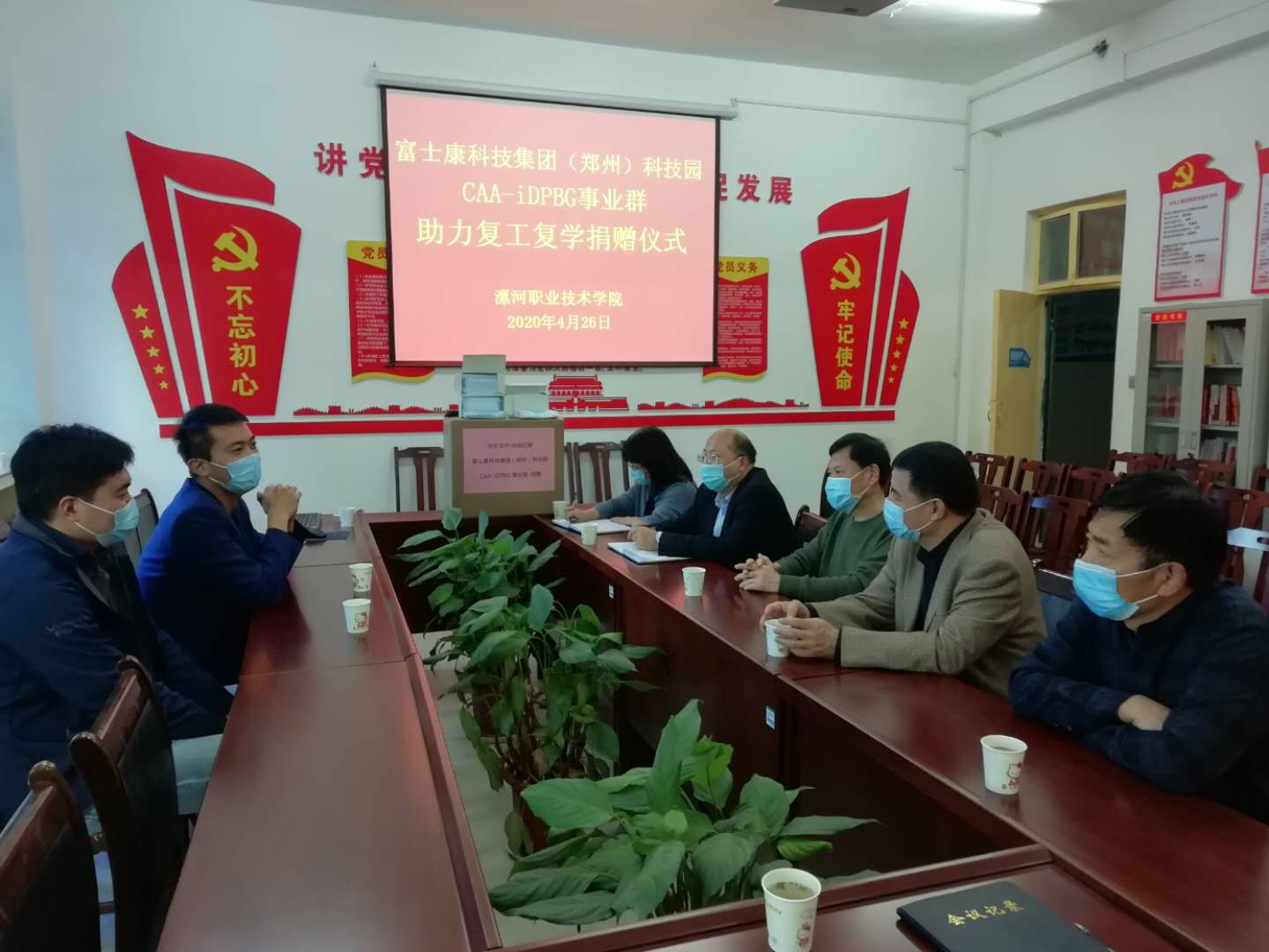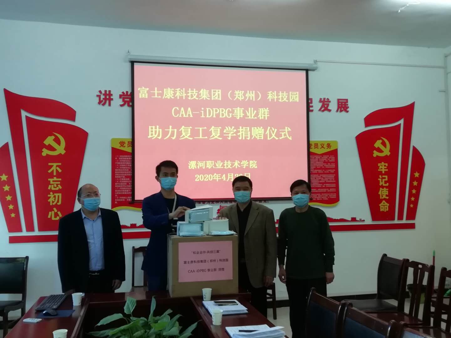 4月26日,在我校机电工程系会议室举行了富士康科技集团(郑州)科技园CAA-iDPBG事业群助力复工复学捐赠仪式举行。富士康科技集团(郑州)科技园CAA-iDPBG事业群经理宋会兵,学校副校长王变奇、机电工程系党总支书记翟迎朝、系行政负责人赵建功及其他班子成员参加捐赠仪式。仪式上,富士康科技集团(郑州)科技园CAA-iDPBG事业群经理宋会兵向学校机电工程系捐赠2000只口罩,助力复学。系行政负责人赵建功代表机电工程系接受捐赠。