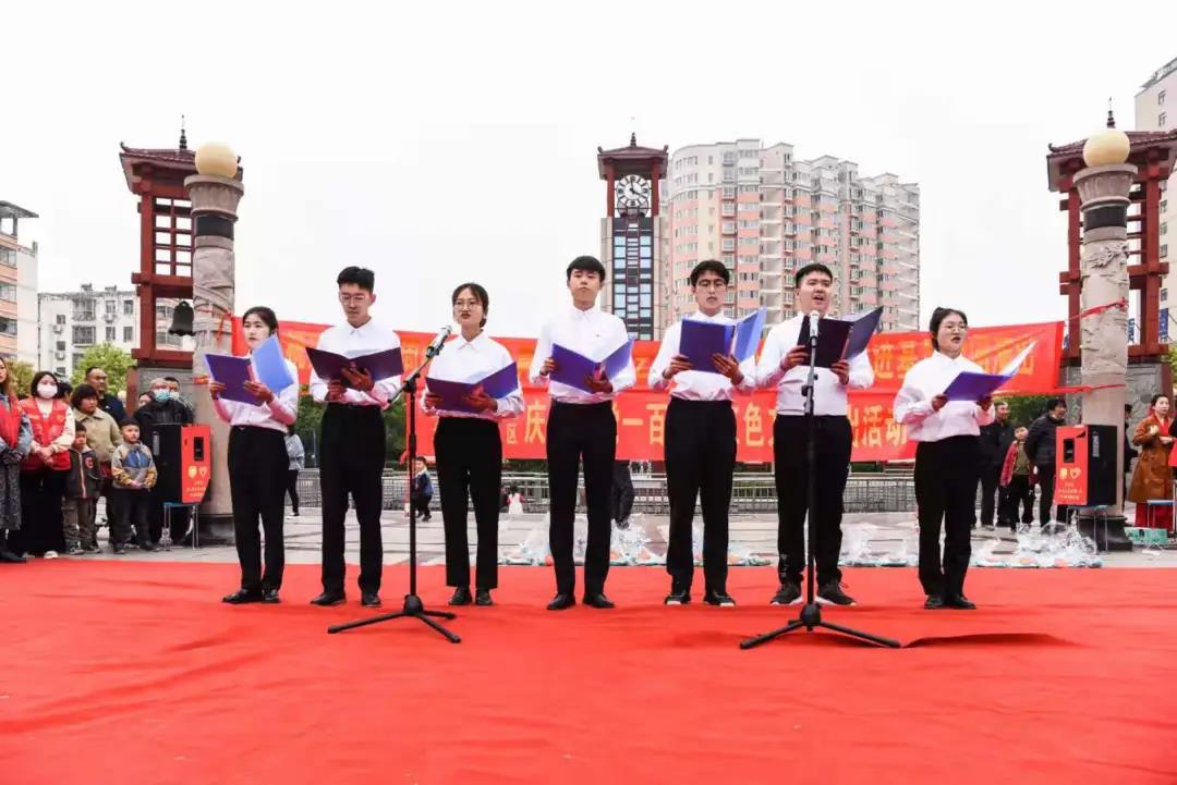 为庆祝中国共产党成立100周年,传递党的声音,宣传红色文化,丰富群众文化生活,4月24日,河南工业大学漯河工学院付宇昂、焦佳豪、程子涵、李博、周真真、李冰楠、徐家家等7名同学参加漯河共青团红色文艺轻骑兵党史学习教育进基层慰问演出活动,走进郾城区龙塔街道钟楼广场,为社区居民群众奉献了一场精彩纷呈的“文化大餐”。