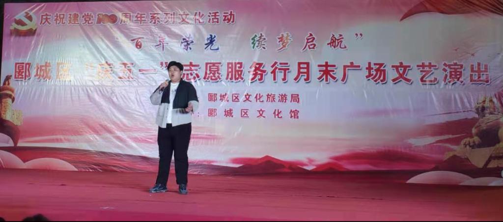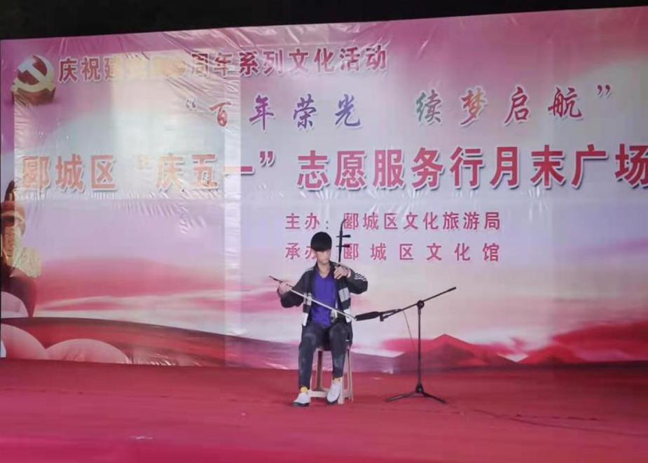 参加“百年荣光 续梦启航”建党100周年文艺演出。刘基、李禧龙两位同学参加由郾城区文化旅游局主办、郾城区文化馆承办的“百年荣光 续梦启航”建党100周年广场文艺演出。刘基一曲《新赛马》,气势磅礴、旋律奔放,无论是气宇轩昂的赛手,还是奔腾嘶鸣的骏马,都被二胡的旋律表现得惟妙惟肖,深受在场人们的喜爱。李禧龙演唱的《不忘初心》,歌声悠扬、感情真挚,让人重温红军战士用生命和热血铸就的悲壮历史,重温革命先辈用理想和信念丈量的伟大远征,充分表达出了共产党人心系百姓、感恩群众的情怀,激荡着一股守初心、担使命的磅礴力量。