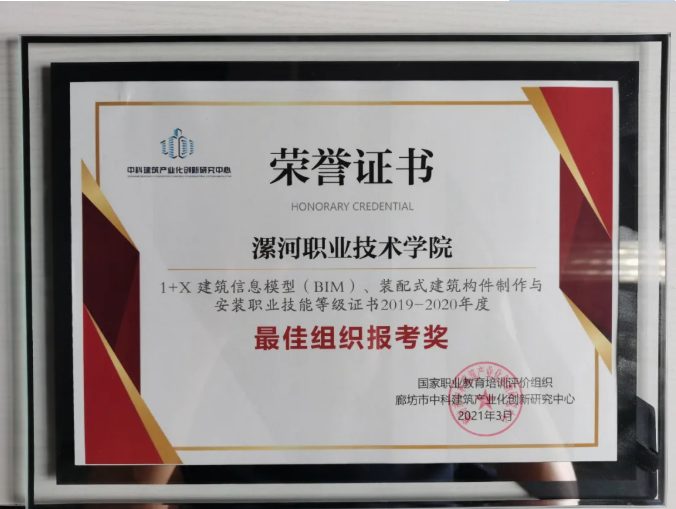 6月11日,河南省建设教育协会职业教育委员会2021年年会暨1+X(BIM、装配式)职业技能等级证书工作会议在河南交通职业技术学院顺利召开。太阳成tyc7111cc在2019-2020年度1+X建筑信息模型(BIM)考评中通过率为100%,获得了国家职业教育培训评价组织颁发的2019-2020年度最佳组织报考奖。