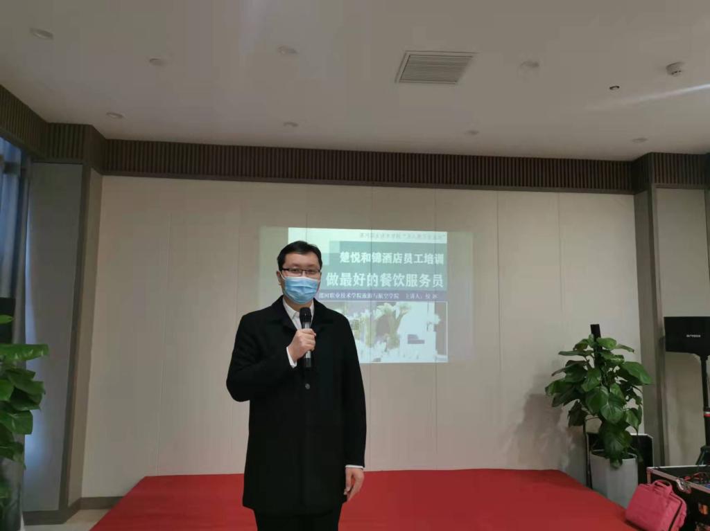 11月18日,旅游与航空学院侯冰老师受邀赴漯河市楚悦和锦酒店开展授课培训,为地方经济建设和社会发展服务。培训对象主要为餐饮部基层管理人员、服务员、迎宾员、传菜员,内容涉及餐前、餐后、餐后各流程典型工作任务中的重难点,